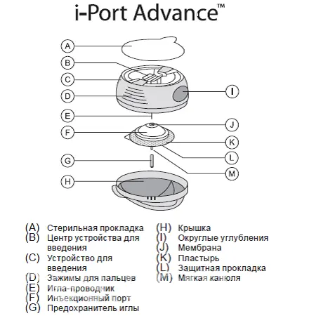 • Верхняя, надкожная часть - это защитный пластиковый корпус, в котором спрятана резиновая мембрана. Для беспрепятственного доступа иглы к мембране в пластиковом корпусе предусмотрено отверстие. На кожу АйПорт крепится при помощи прочного пластыря.