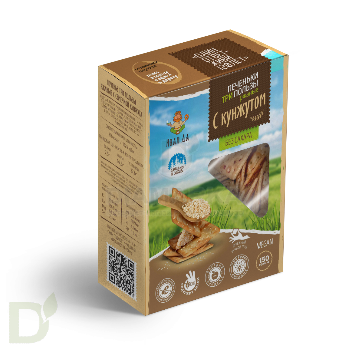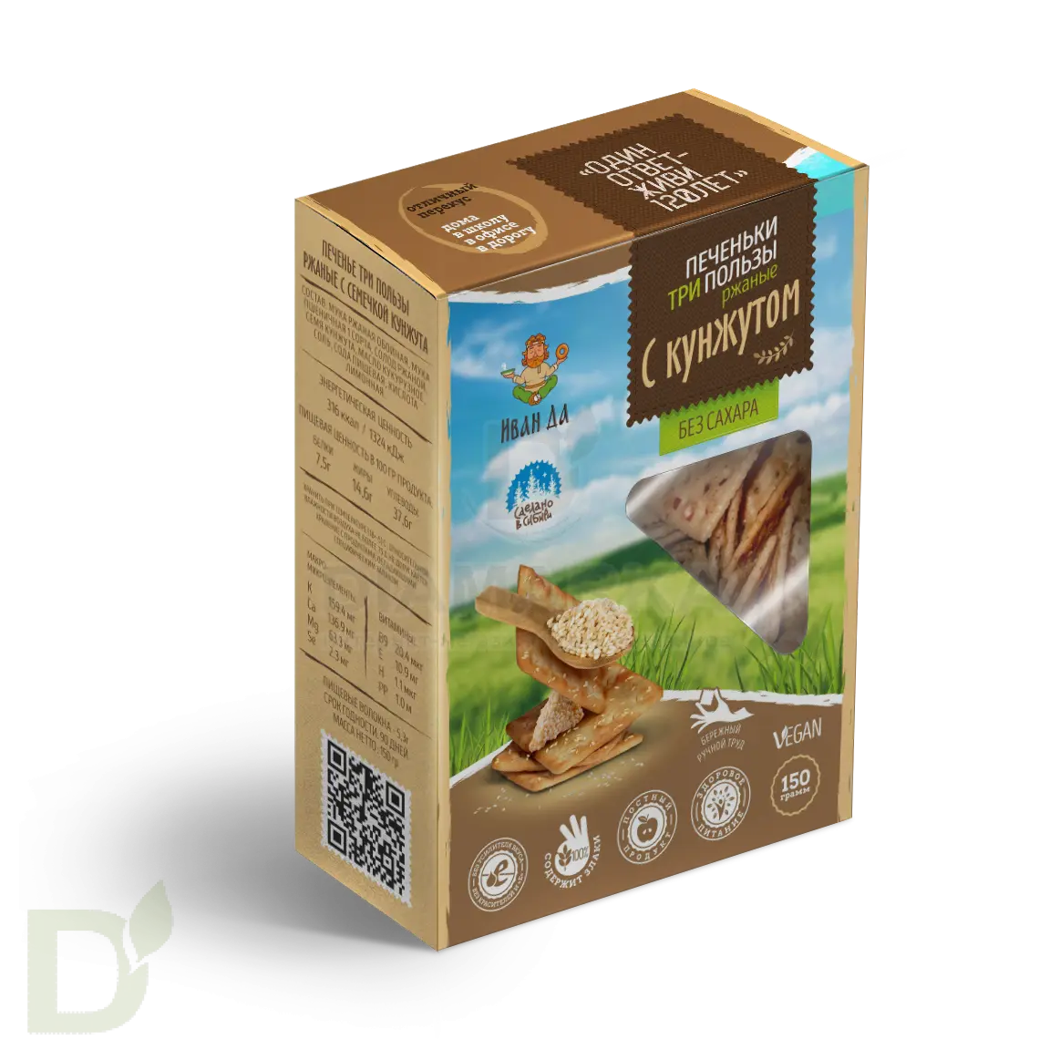 Печенье "Три пользы" от бренда "Иван-ДА" - это уникальный продукт, который не только порадует вас своим вкусом, но и принесет пользу для вашего здоровья. Это хрустящее ржаное печенье с добавлением кунжута и натуральным составом.